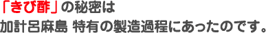 その昔、サトウキビから黒砂糖を作るとき、窯を洗った水が発酵して酢になることに島の先人が気づきました。そして発酵を助けてくれたのが、この島周辺にだけ浮遊する酢酸菌と南国ならではの湿度と気温だったのです。あたりまえのように毎日この酢を食すうち、加計呂麻は長寿の島になりました。