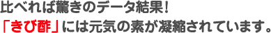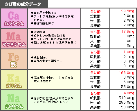 下表の成分データをじっくりとご覧ください。一般の酢と比べて「きび酢」にはカルシウムなどのミネラル分がはるかに豊富に含まれ、逆に高血圧の原因と言われるナトリウムは微量です。このバランスのとれた成分がさまざまな生活習慣病を予防し、体のリズムを整えてくれるのです。