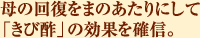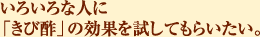 「きび酢」は特に血液浄化作用に優れており、高血圧、糖尿病をはじめとした生活習慣病の予防、改善に効果が期待されます。ほかにも疲労回復、アレルギー体質の改善、コレステロール値の低下なども期待でき、結果的にダイエットにつながるということも考えられます。「出会えてよかった。」という体験談をたくさんいただいています。「きび酢」をより多くの方達に伝えていく…これは私が生涯続けていかなければならないことだと思っています。 |