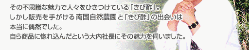 平成8年、社員旅行で奄美大島へ行きました。社員に奄美出身者がいて、彼と、当時 きび酢工場の工場長だった昌谷栄四郎氏とが同級生だったんです。一緒に食事をしながら、一次会、二次会と盛り上がるうち、昌谷氏が「いいものがある。」と「きび酢」のことを熱っぽく語り始めました。本当に彼の一生懸命さが伝わってきました。岡山に戻るとサンプルや資料が送られてきて、試すうち「これはいいな。」という直感のようなものを感じました。そして何よりも昌谷氏の人間性にひかれて「きび酢」をもっと広めたいと思ったのです。
